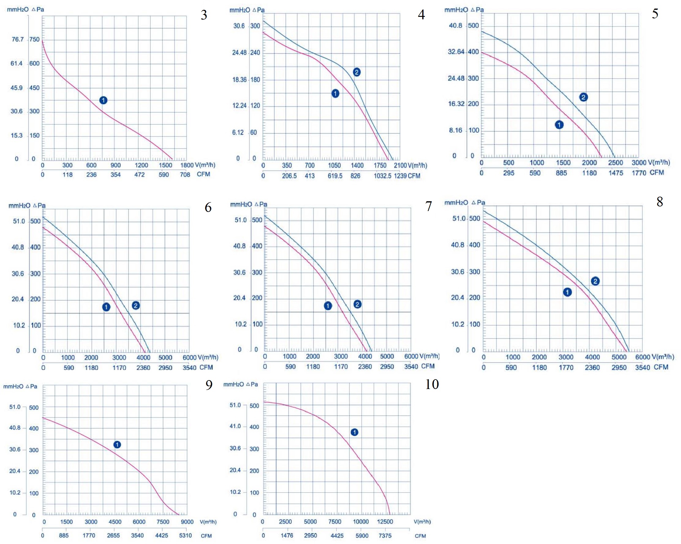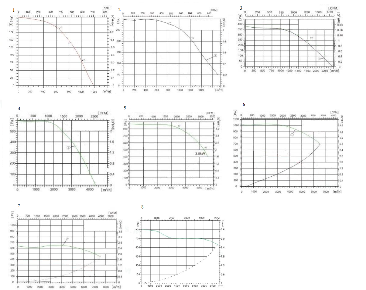 | Марка. | Живлення. | Потужн. Вт. | Обертів за хв. | Продукт. м3/год | Статичний тиск Па. |